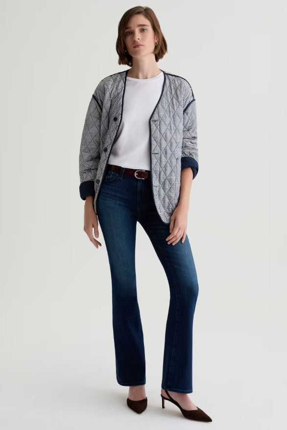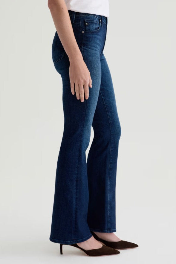 These women’s denim jeans feature a high-rise/mid-rise flare-leg style with a classic 5-pocket construction. Crafted from a cotton-based twill fabric blended with elastane, they offer both comfort and stretch. The rich, deep blue denim has subtle tonal variations for a lived-in look.
