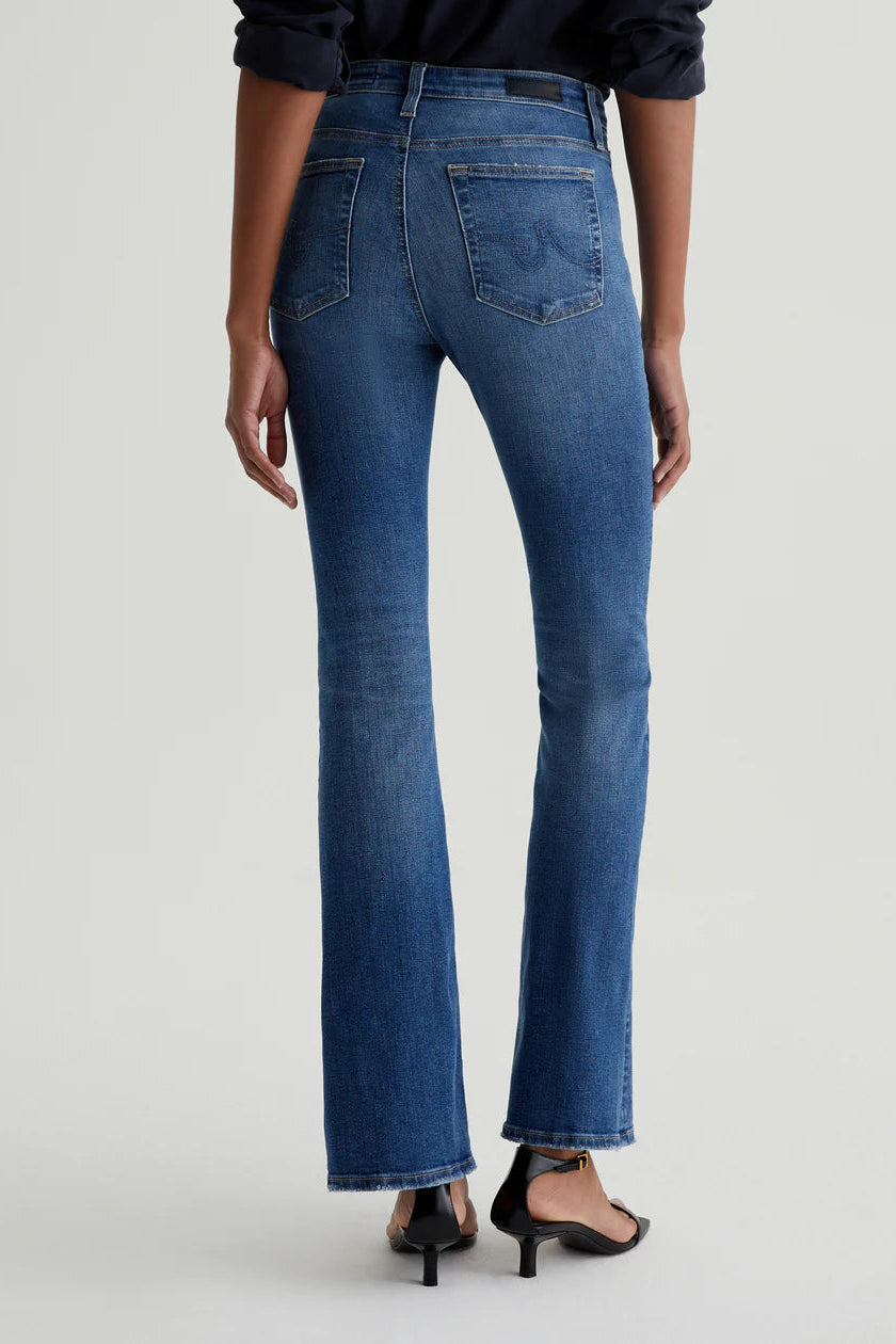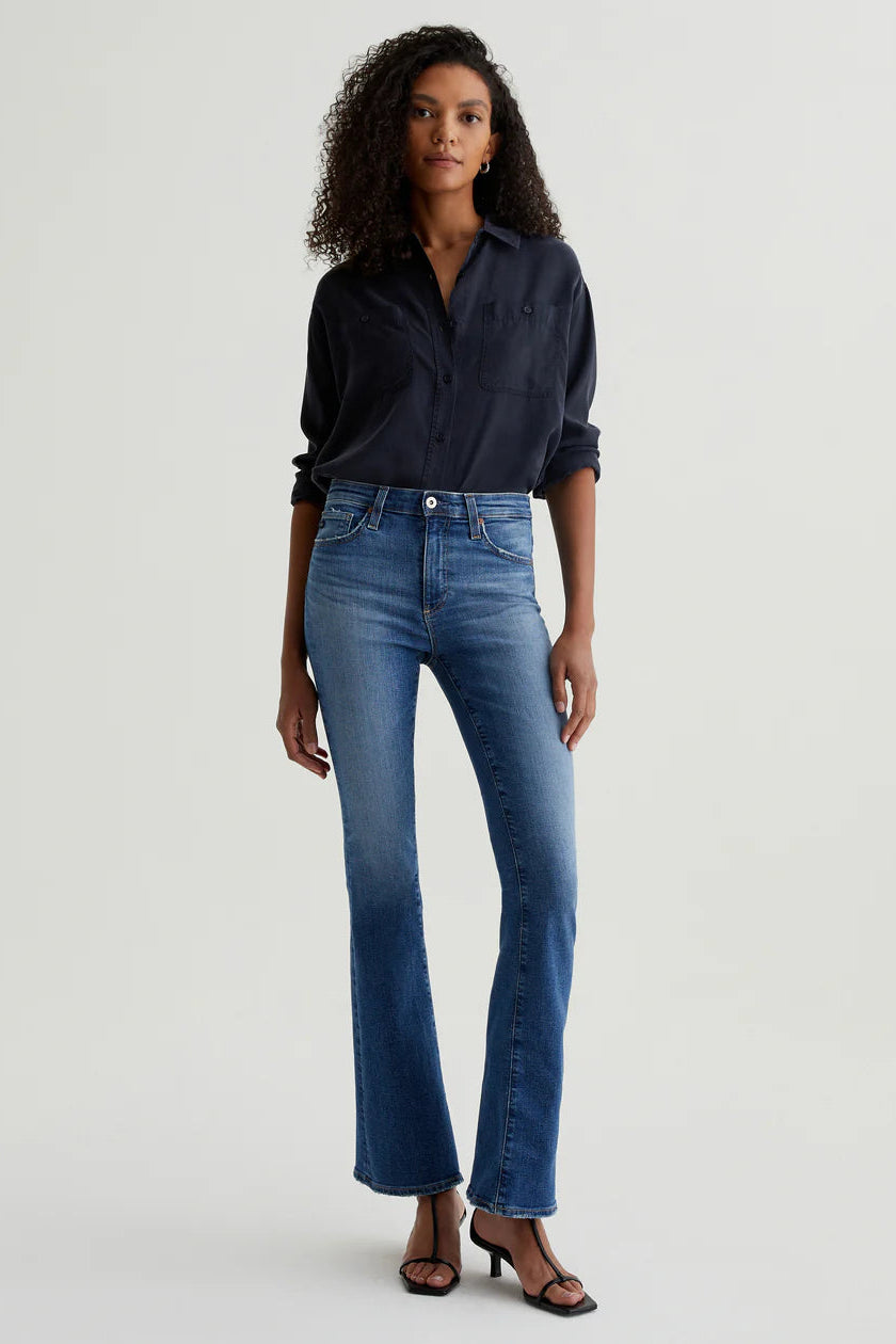 This is a pair of women’s high – waisted bootcut jeans. They are crafted from a denim blend with cotton as the main component and a touch of spandex for stretch. The jeans have a gradient wash of blue, with a lighter shade on the upper thighs and hips and a darker shade on the lower legs. The flared leg starts from the knee, and the high – rise waist gives a flattering silhouette.