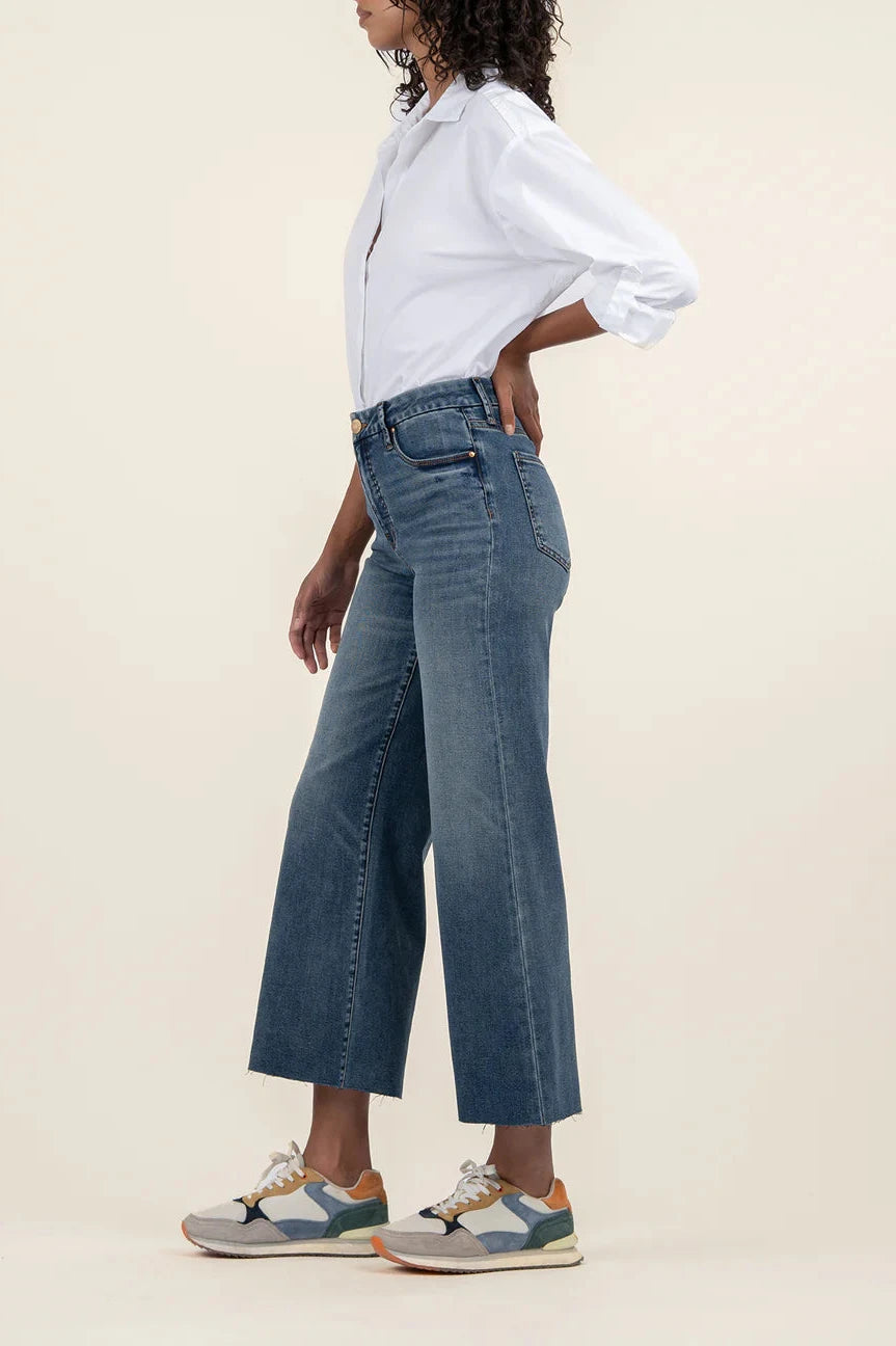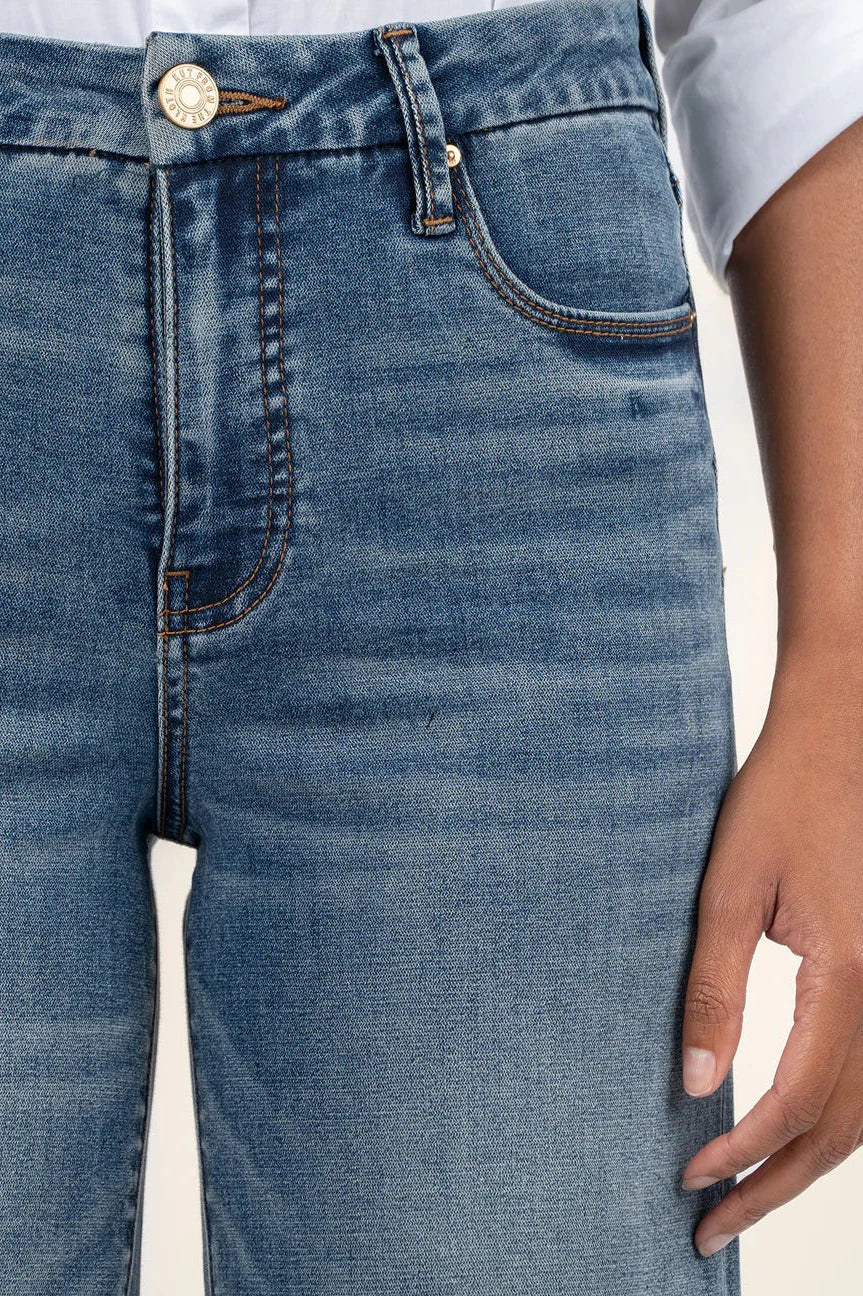 These women’s denim jeans are a stylish addition to any wardrobe. With a high – rise waist and wide – leg, cropped silhouette, they offer a trendy and flattering look. The medium blue denim has a faded finish and subtle distressing, along with a frayed hem for a vintage touch.